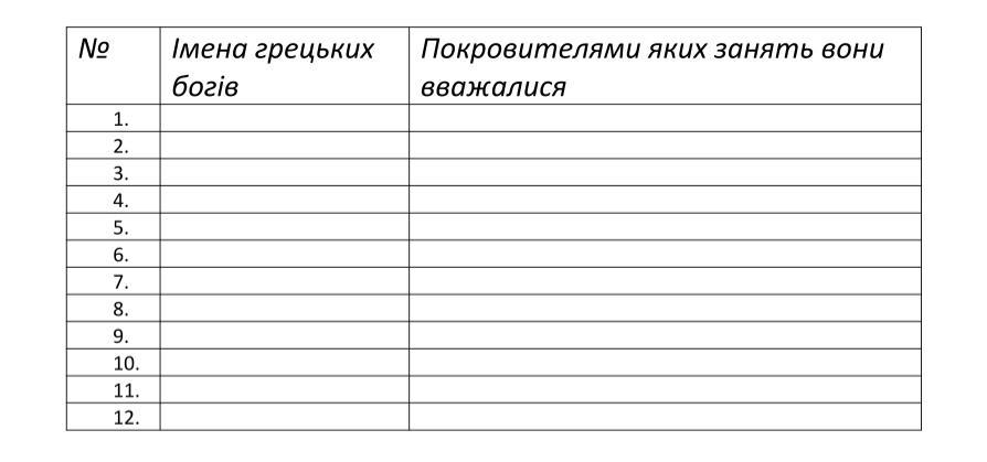 СРОЧНО ПОМОГИТЕ!(Запишіть у таблицю (додається) імена 12 грецьких богів!!!ДАМ 50 баллов!!