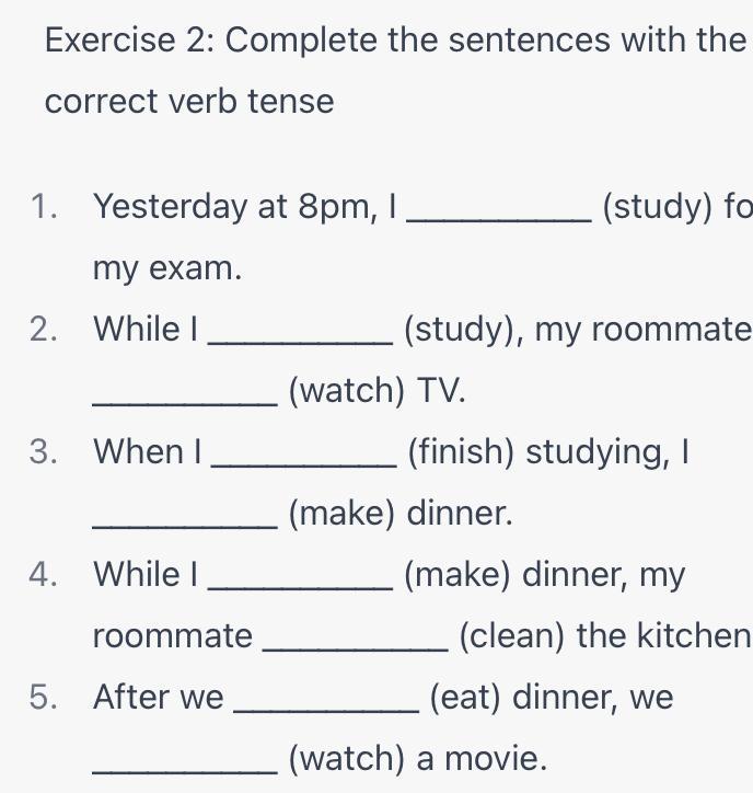 1-studied 2-im studying, is watching 3-finish,will make 4-im making,is cleaning 5-ate,watched