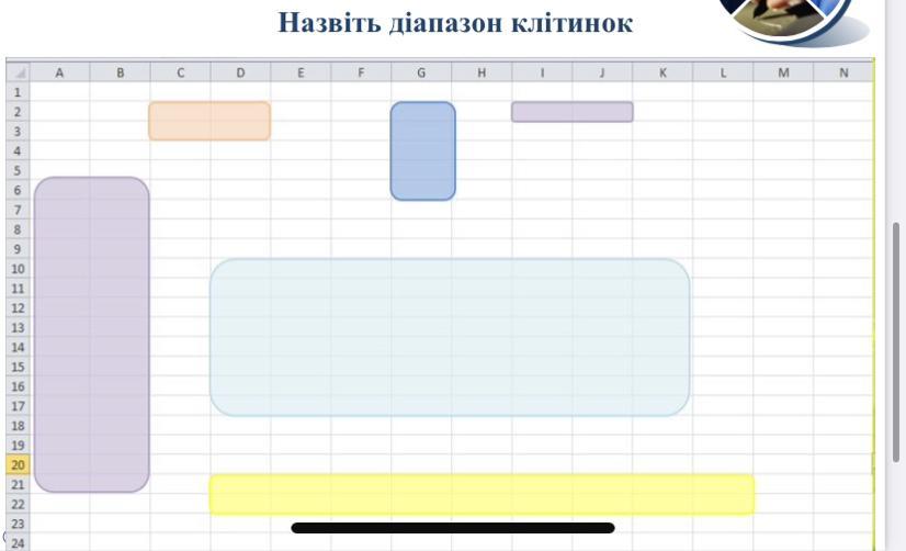 Фіолетова - A6:B21; Оранжева - С2:D3; Синя - G2:G6; Меньша фіолетова - I2:J2; Голуба - D10:K17; Жовта - D21:L22