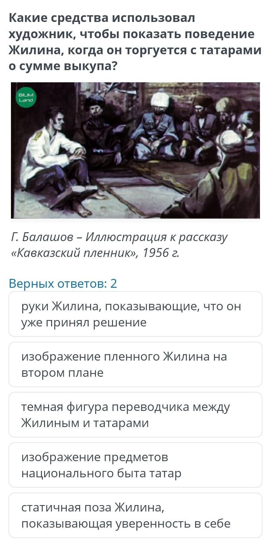 Какие средства использовал художник, чтобы показать поведение Жилина, когда он торгуется с татарами о сумме выкупа? BIUM Land Г.Балашов-Иллюстрация к рассказу «Кавказский пленник», 1956 г. Верных ответов: 2 руки Жилина, показывающие, что он уже принял решение изображение пленного Жилина на втором плане темная фигура переводчика между Жилиным и татарами изображение предметов национального быта татар статичная поза Жилина, показывающая уверенность в себе