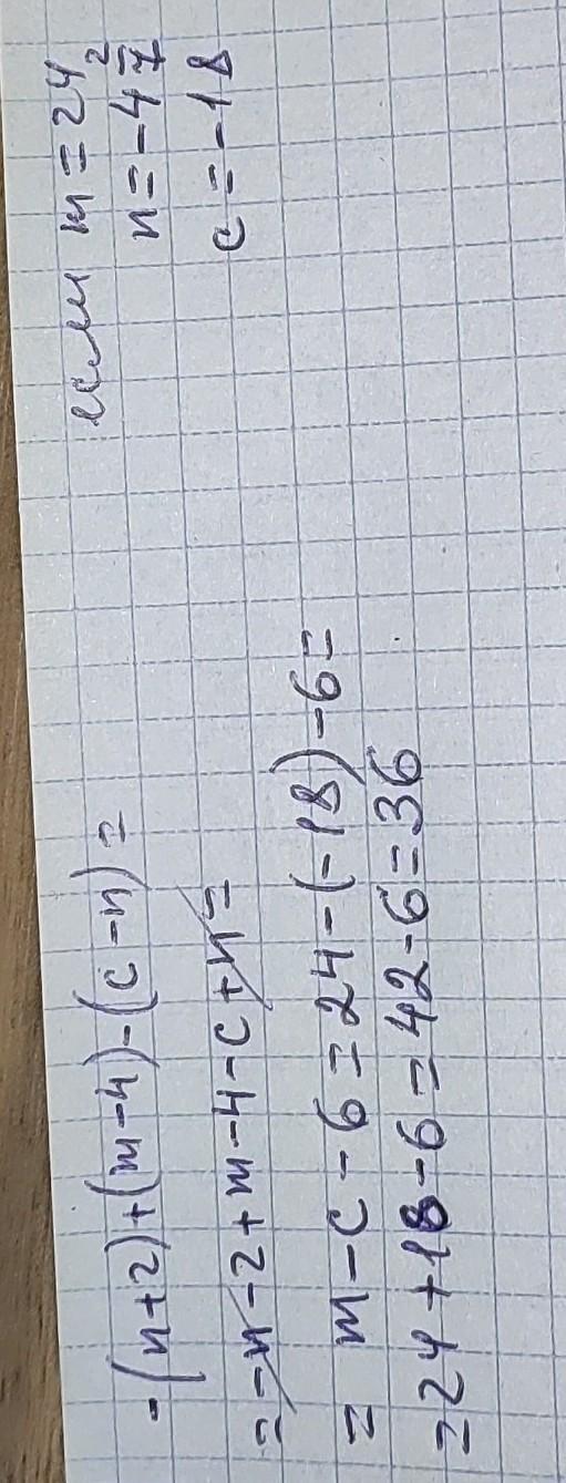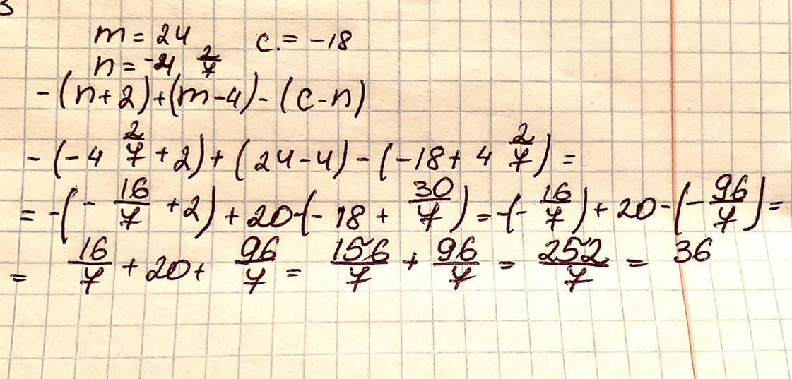 -(n+2)+(m-4)-(c-n)= та знайди його значення, якщо m=24, n= -4(цілих) 2/7, c=-18