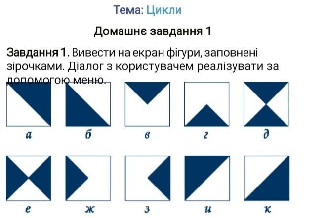 Тема: Цикли Домашнє завдання 1 Завдання 1. Вивести на екран фігури, заповнені зірочками. Діалог з користувачем реалізувати за допомогою меню. срочно!!c++,visual studio!!!