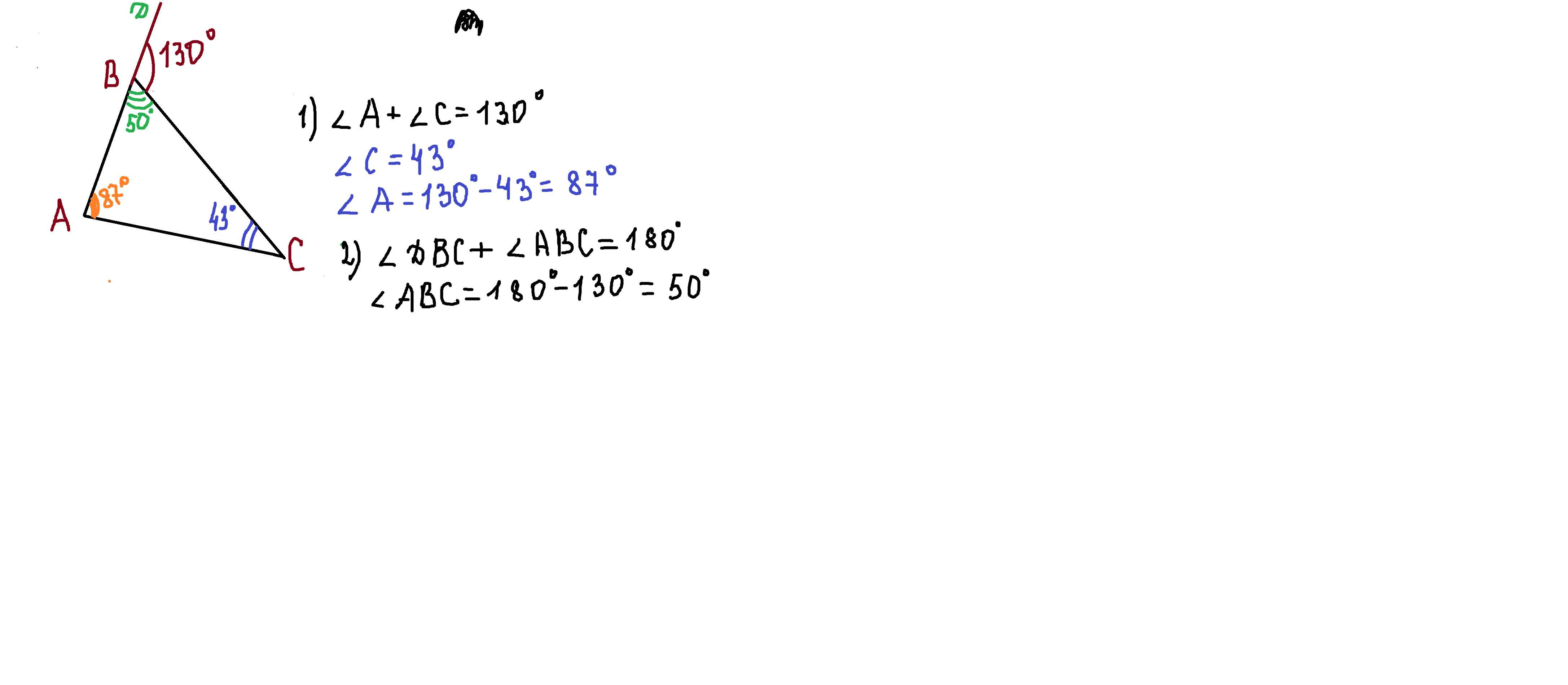 2) внешний угол треугольника вместе с внутренним образуют смежные углы,их сумма равна 180,и тогда можно найти внутренний угол В,он равен 50 градусам