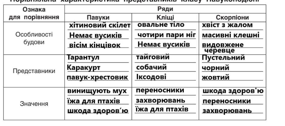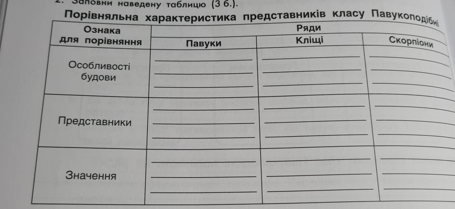 2. Заповни наведену таблицю (3 б.). Порівняльна характеристика представників класу Павукоподібн Скорпіони Ознака для порівняння Особливості будови Представники Значення Павуки Ряди Кліщі