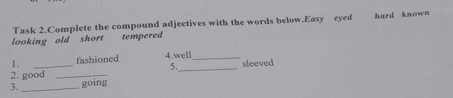 СРОЧНО Task 2.Complete the compound adjectives with the words below.Easy eyed looking old short tempered 1. 2. good 3. d fashioned going 4.well 5. sleeved hard known