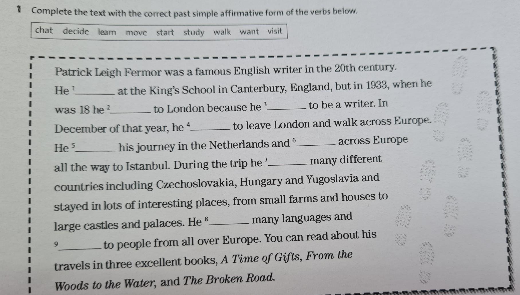 1 Complete the text with the correct past simple affirmative form of the verbs below. chat decide learn move start study walk want visit I Patrick Leigh Fermor was a famous English writer in the 20th century. 1 He ¹ at the King's School in Canterbury, England, but in 1933, when he to London because he 3. to be a writer. In was 18 he 2 December of that year, he 4. He 5 9 to leave London and walk across Europe. his journey in the Netherlands and 6 across Europe 7 all the way to Istanbul. During the trip he many different countries including Czechoslovakia, Hungary and Yugoslavia and stayed in lots of interesting places, from small farms and houses to large castles and palaces. He 8. many languages and to people from all over Europe. You can read about his travels in three excellent books, A Time of Gifts, From the Woods to the Water, and The Broken Road. 14