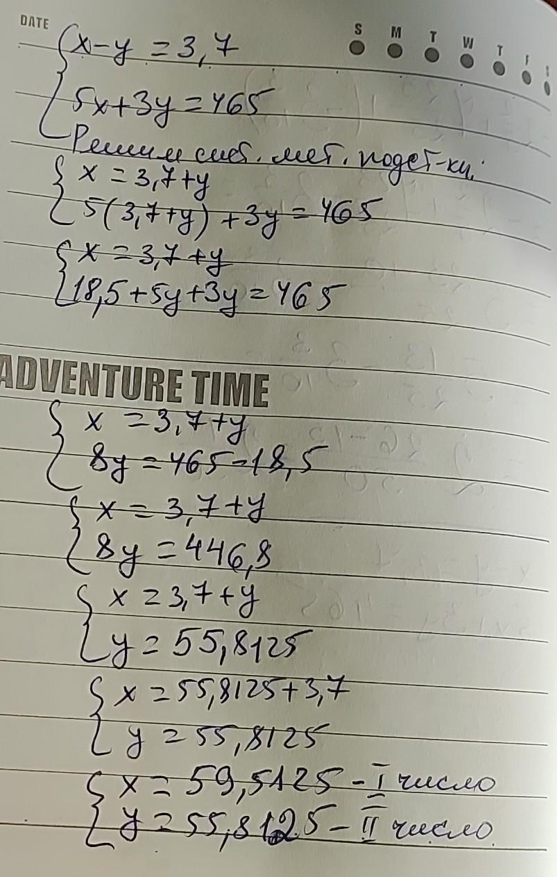 Разность двух данных чисел равна 3,7 Если уменьшаемое увеличить в пять раз а вычитаемое в три раза то сумма полученных чисел равна 465 Найди данный числа