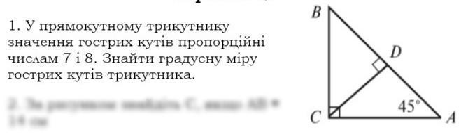 1. У прямокутному трикутнику значення гострих кутів пропорційні нислам 7 і 8. Знайти градусну міру гострих кутів трикутника. В C D 45° A