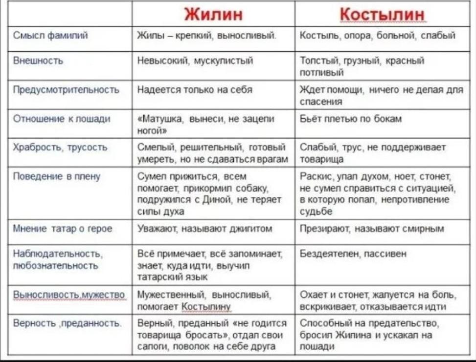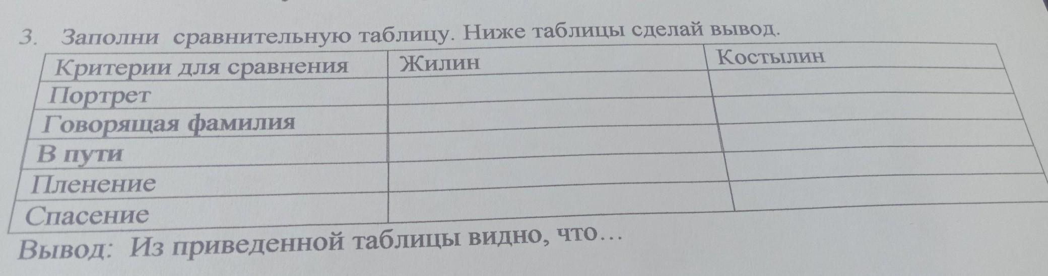 Заполни сравнительную таблицу. Ниже таблицы сделай вывод. Костылин Жилин Критерии для сравнения Портрет Говорящая фамилия В пути Пленение Спасение Вывод: Из приведенной таблицы видно, что...