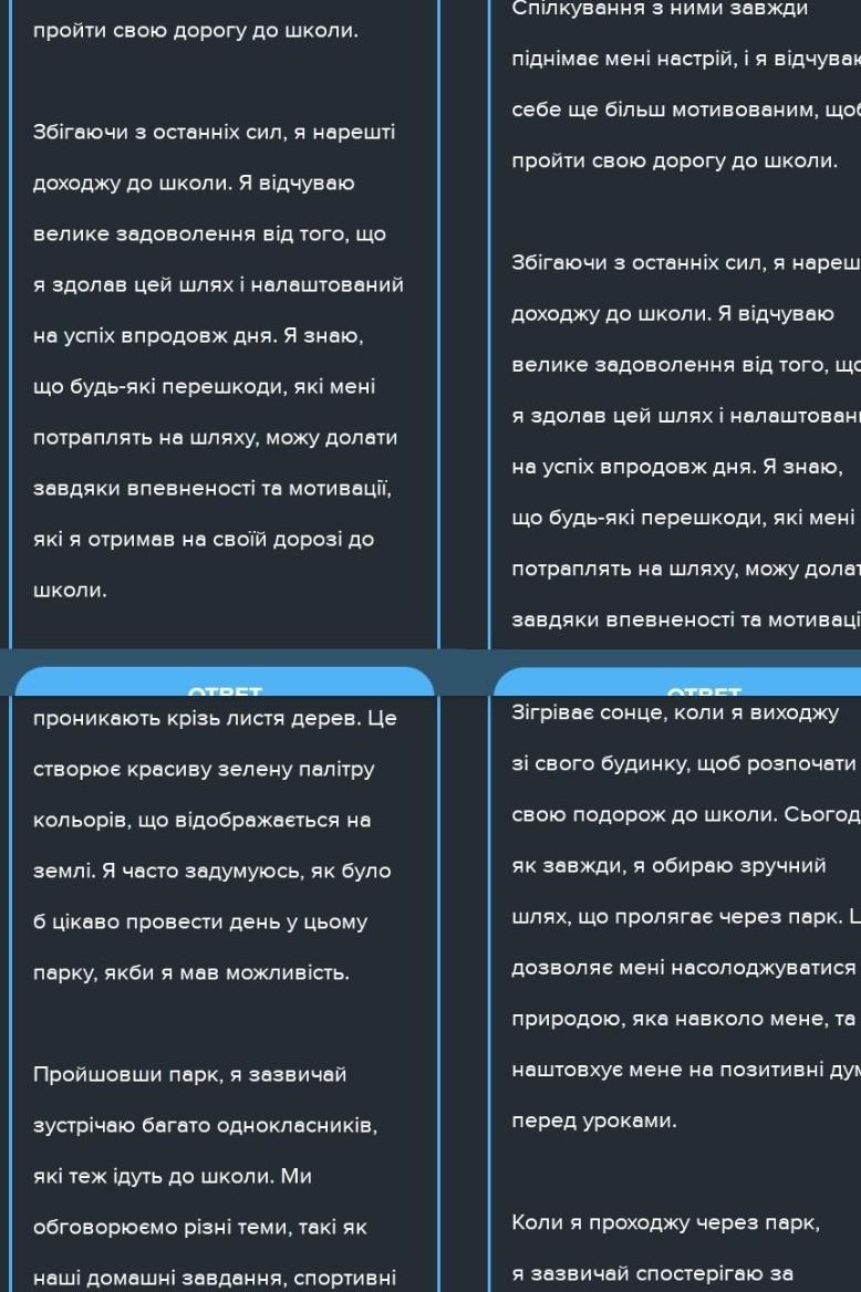 Зігріває сонце, коли я виходжу зі свого будинку, щоб розпочати свою подорож до школи. Сьогодні, як завжди, я обираю зручний шлях, що пролягає через парк. Це дозволяє мені насолоджуватися природою, яка навколо мене, та наштовхує мене на позитивні думки перед уроками.