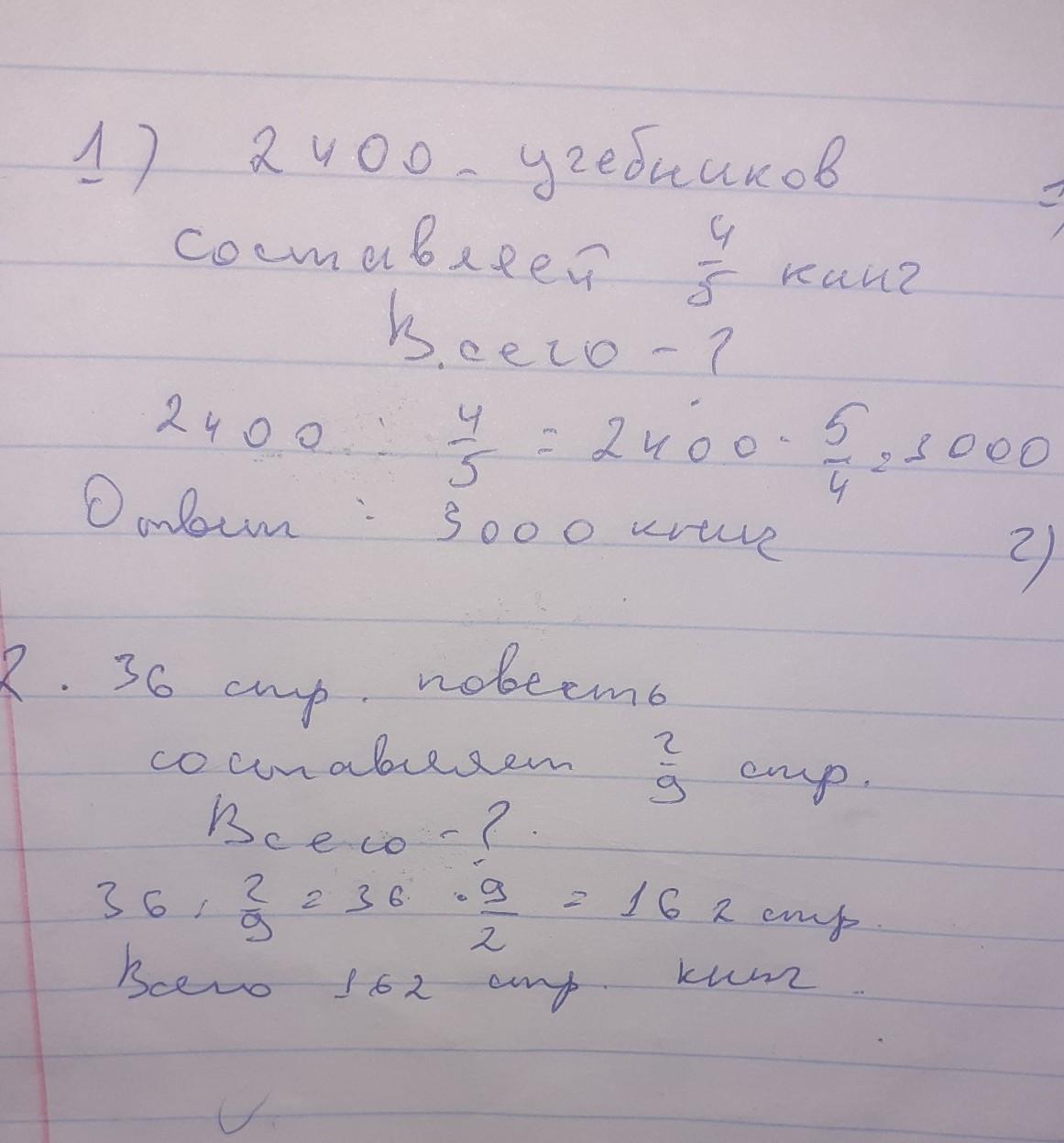 какая мо ДОМАШНЕЕ ЗАДАНИЕ 10 Реши задачи. ставляет а) в школьной библиотеке 2 400 учебников, что со- 3 всех книг. Сколько всего книг в библиотеке? 6) Повесть заняла 36 страниц книги, что составило части общего количества страниц. Сколько всего стра- ниц в книге? 9