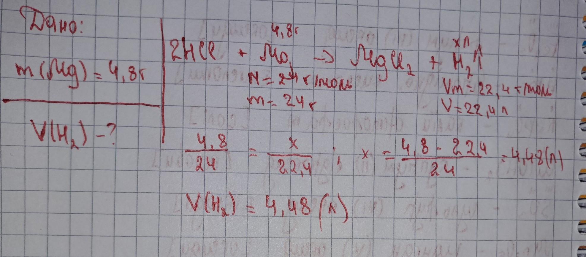 Обчисліть об'єм водню (н.у.), який виділяється у результаті взаємодії хлоридної кислоти з 4,8 г магнію?