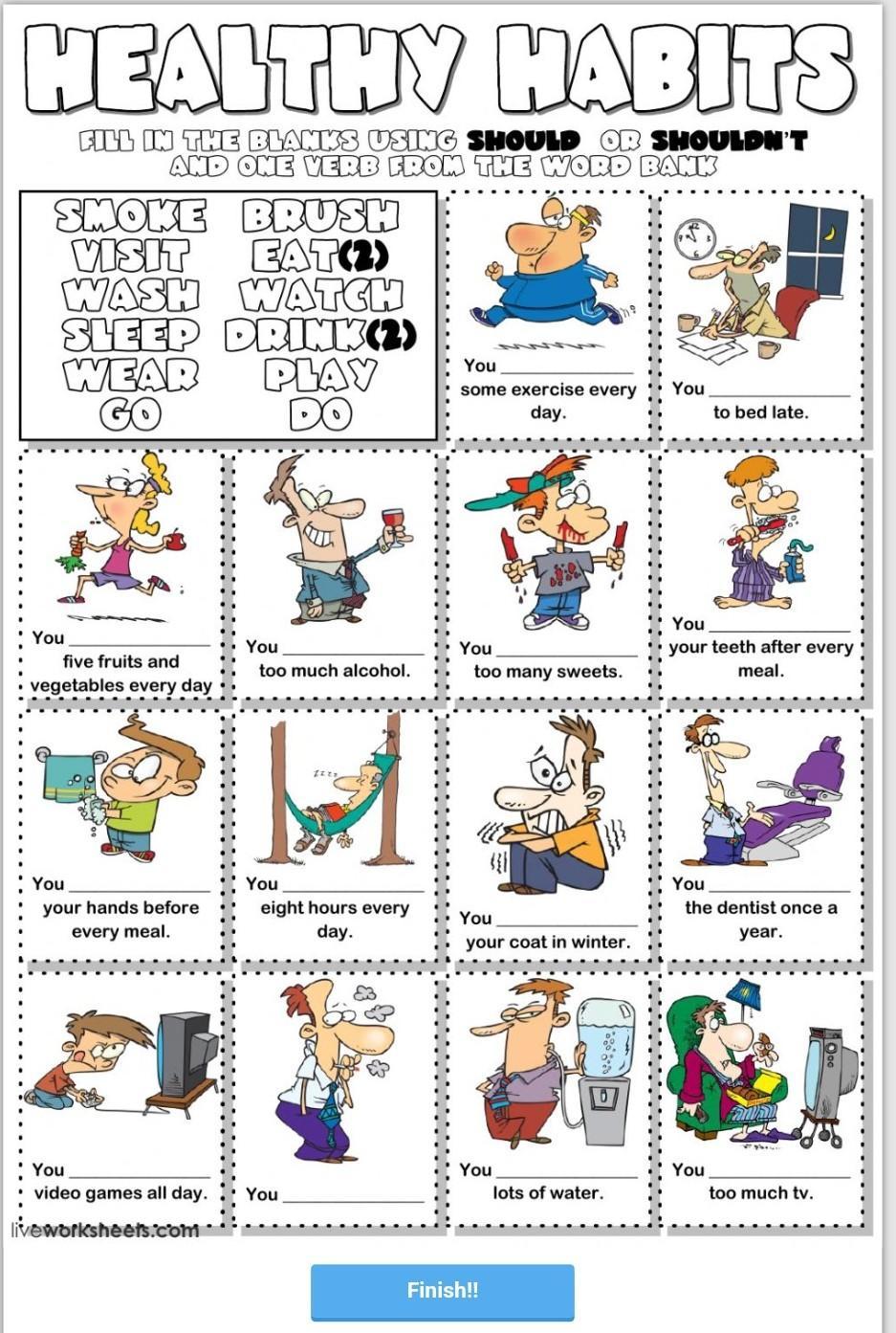 HEALTHY HABITS FILL IN THE BLANKS USING SHOULD OR SHOULDN'T AND ONE VERB FROM THE WORD BANK SMOKE BRUSH EAT(2) VISIT WASH WATCH SLEEP DRINK(2) WEAR PLAY GO DO You five fruits and vegetables every day You your hands before every meal. You too much alcohol. You eight hours every day. You video games all day. You liveworksheets.com You some exercise every You day. You too many sweets. You your coat in winter. You Finish!! lots of water. to bed late. You your teeth after every meal. You the dentist once a year. You too much tv.