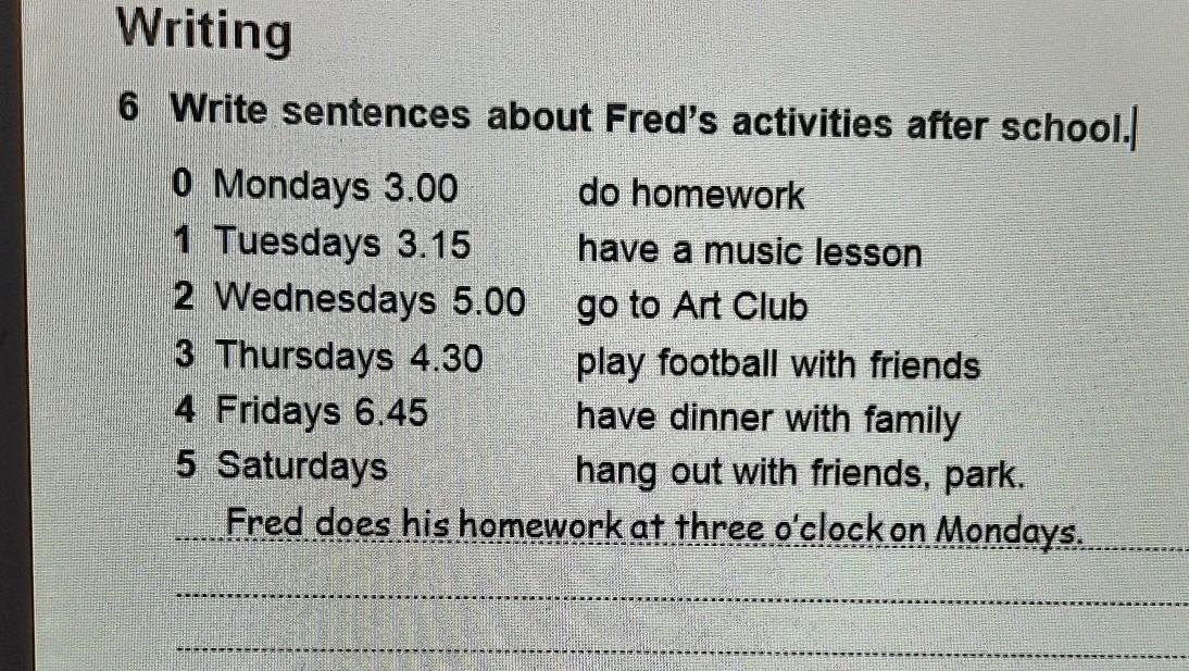 On Tuesdays, Fred has a music lesson at 3.15 pm.