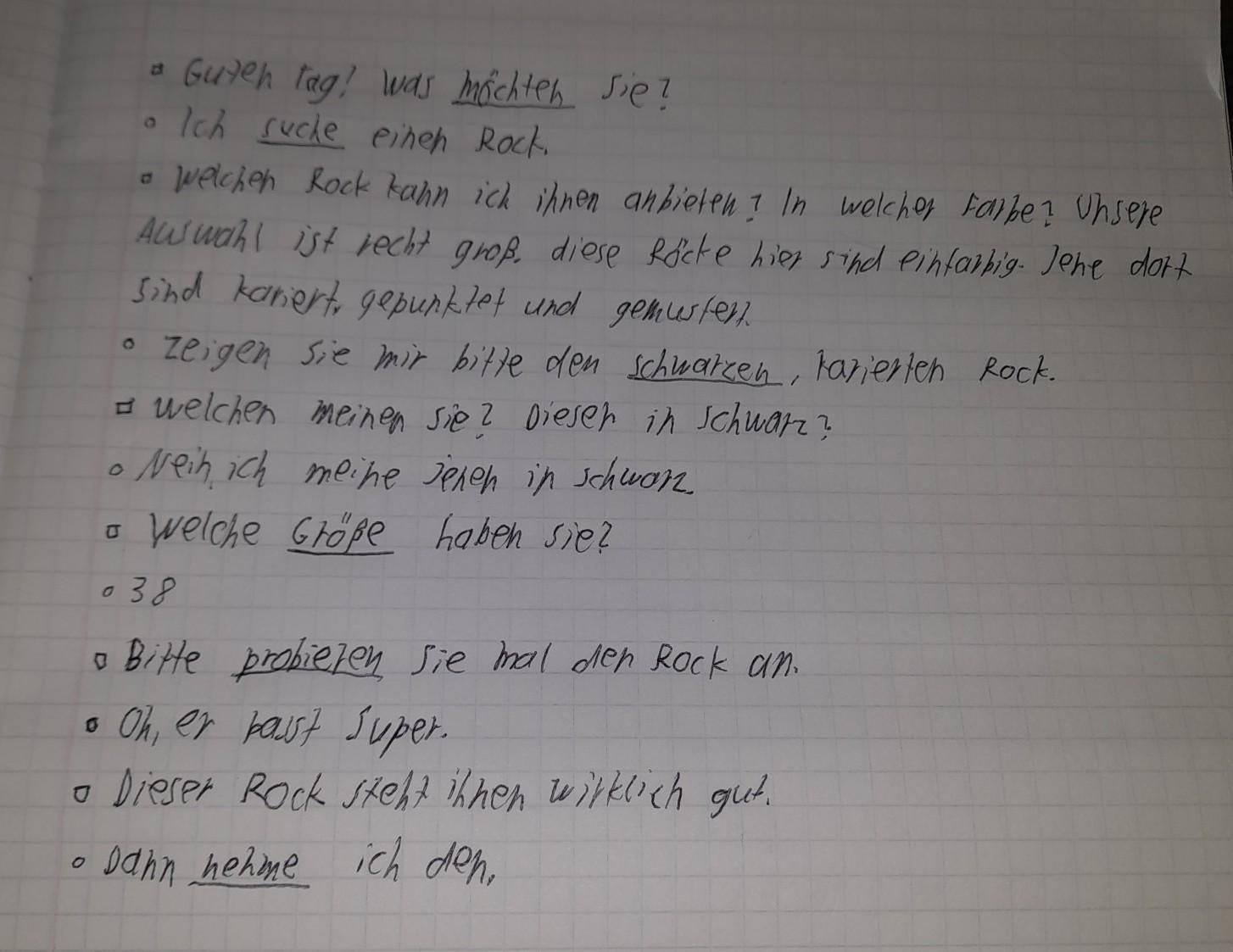 Verkäuferin: Welchen Rock kann ich Ihnen anbieten? In welcher Farbe?