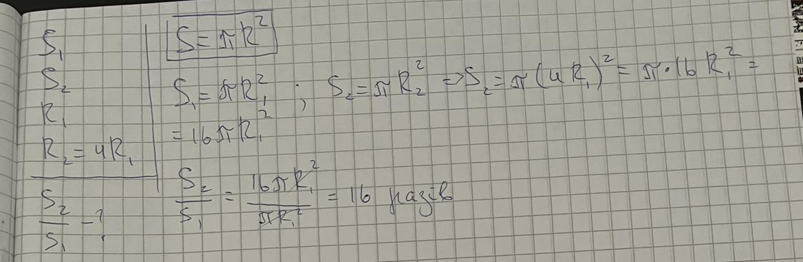 Площа нового круга (у якого радіус в 4 рази більше, ніж у першого круга) буде в 16 разів більшою за площу першого круга.