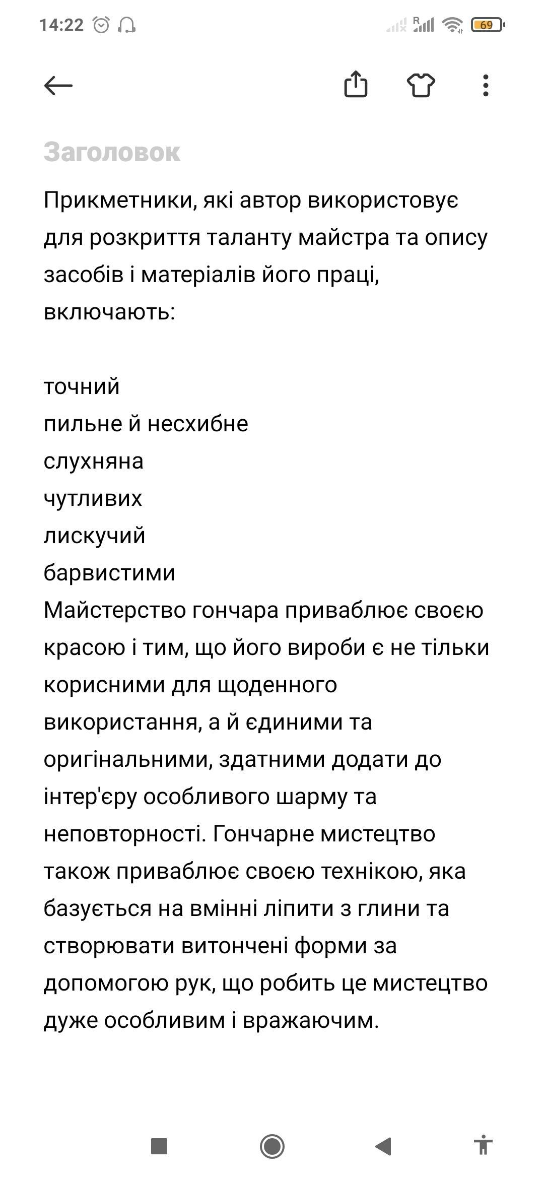 459 1. Прочитайте текст. Назвіть прикметники, за допомогою яких автор розкриває талант майстра, описує засоби й матеріали його праці. Чим, на вашу думку, приваблюе гончарне мистецтво? МИСТЕЦТВО ГОНЧАР глиняний посуд! ЙОГО ліпили на щоденну потребу, але оздоблювали, як велику коштовність. Що то за краса Майстри-гончарi - Нога розкручувала схожий на дзигу гончарний круг, а руки тим часом формували зі старанно розмішаної, як тісто, глини й миски, і кухлі, і горщи- ки, і макітри. Кожен рух у майстра точний, а око пильне й несхибне. Отож і глина слухняна. Ось гончар поклав на круг невеликий шматок глини, умочив руки у воду - і вже росте між його чутливих долонь лискучий стовпчик, що, нiби помахом чарівноï палички, перетворюється на посудину. Готовий виріб майстер зрізає з круга тонесенькою дротиною та ставить сушитися. Після цього посуд розмальовують барвистими квітками й випалюють у спеціальній печі - горні (За В. Рисцовим).