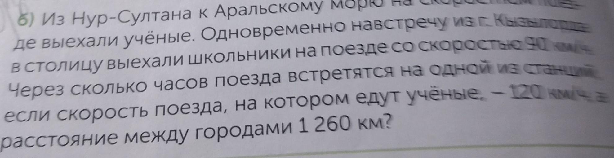 6) Из Нур-Султана к Аральскому морю на скоростном поез- де выехали учёные. Одновременно навстречу из г. Кызылорда в столицу выехали школьники на поезде со скоростью 90 км/ч. если скорость поезда, на котором едут учёные, – 120 км/ч, а Через сколько часов поезда встретятся на одной из станций, расстояние между городами 1 260 км? пж помогите СРОЧНО!!!! Условия
