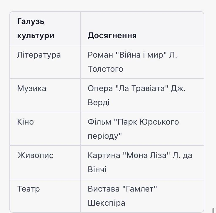 Окремі галузі культури можуть мати безліч досягнень, тому ми надамо загальний приклад таблиці з кількома галузями культури та їх досягненнями: