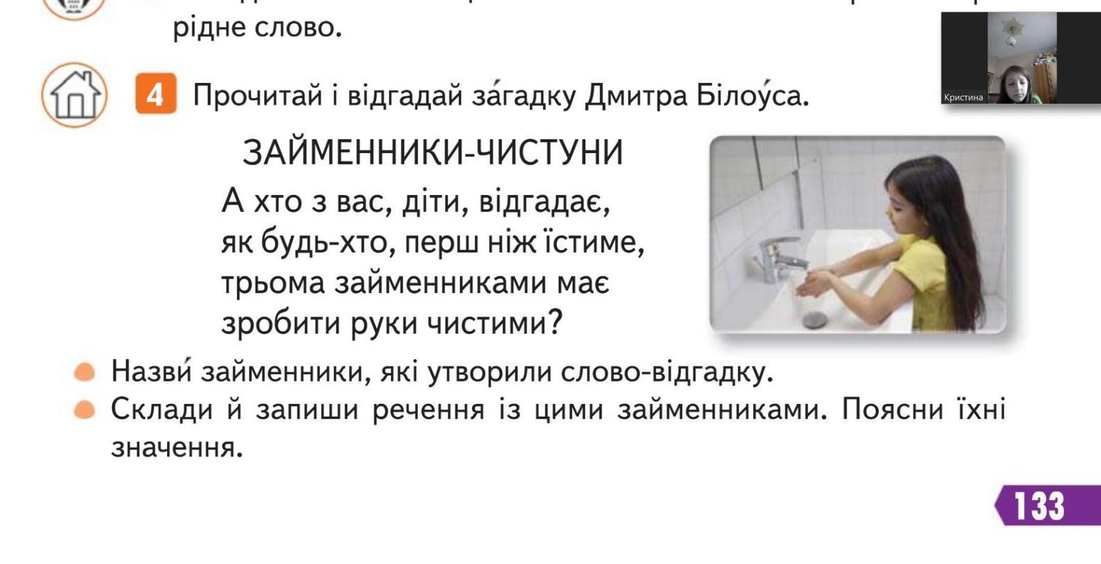 Прочитай і відгадай загадку Дмитра Білоуса. ЗАЙМЕННИКИ-ЧИСТУНИ А хто з вас, діти, відгадає, як будь-хто, перш ніж їстиме, трьома займенниками має зробити руки чистими? Назви займенники, які утворили слово-відгадку. Склади й запиши речення із цими займенниками. Поясни їхні значення.