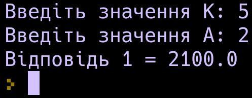 У цьому коді використана функція input(), щоб запитати користувача про значення k та a. Потім значення використовуються у формулі, і результат виводиться на екран разом зі словами "Відповідь 1 =".