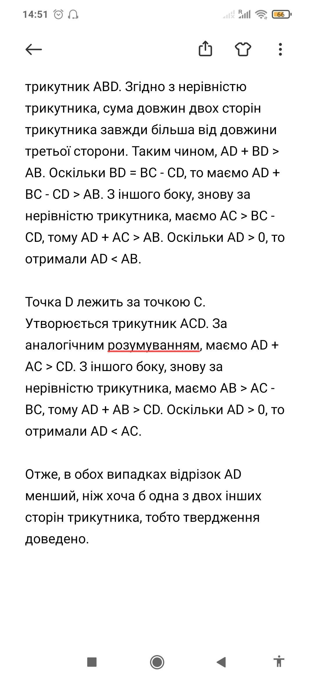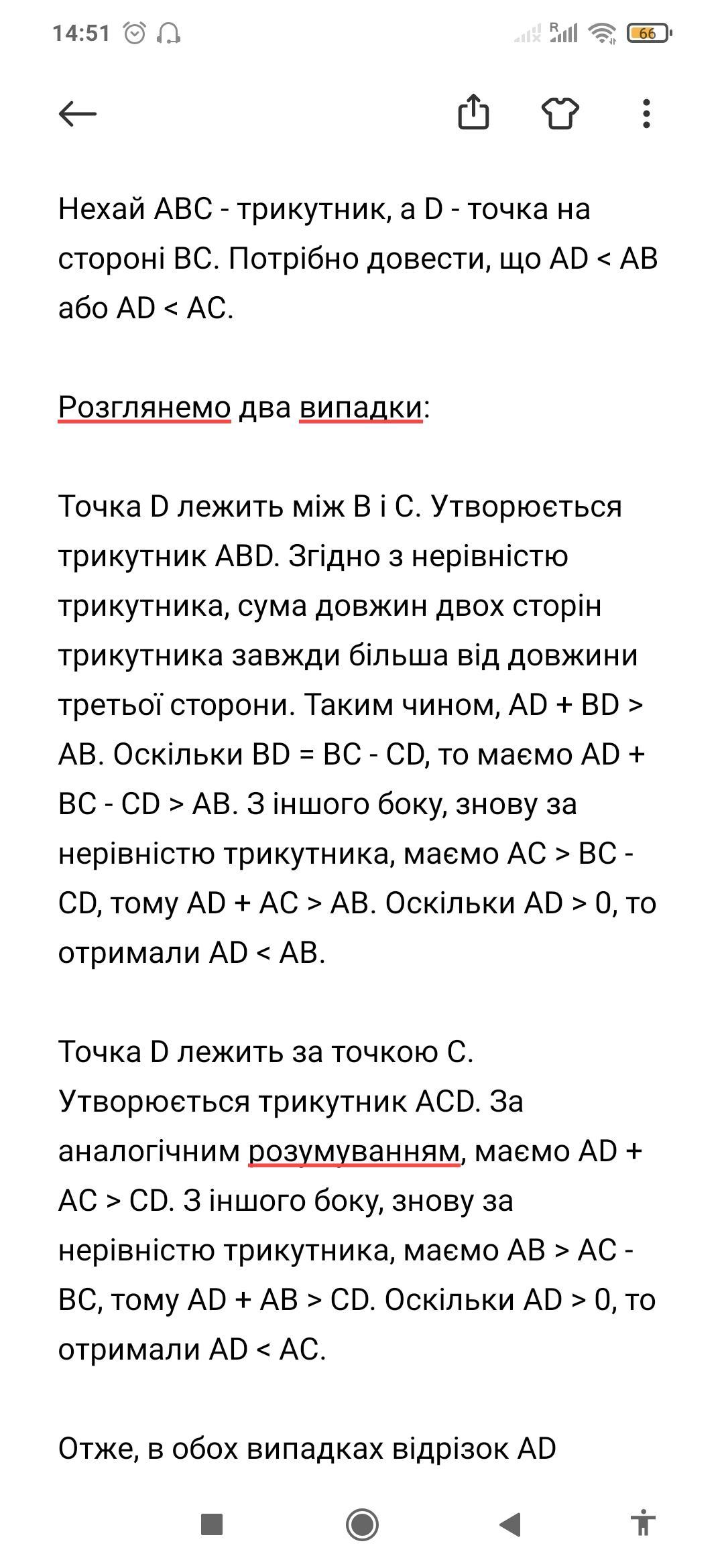 Доведіть, що відрізок, який сполучає вершину трикутника з точкою, яка лежить на протилежній стороні, не більший хоча б одну з двох інших сторін