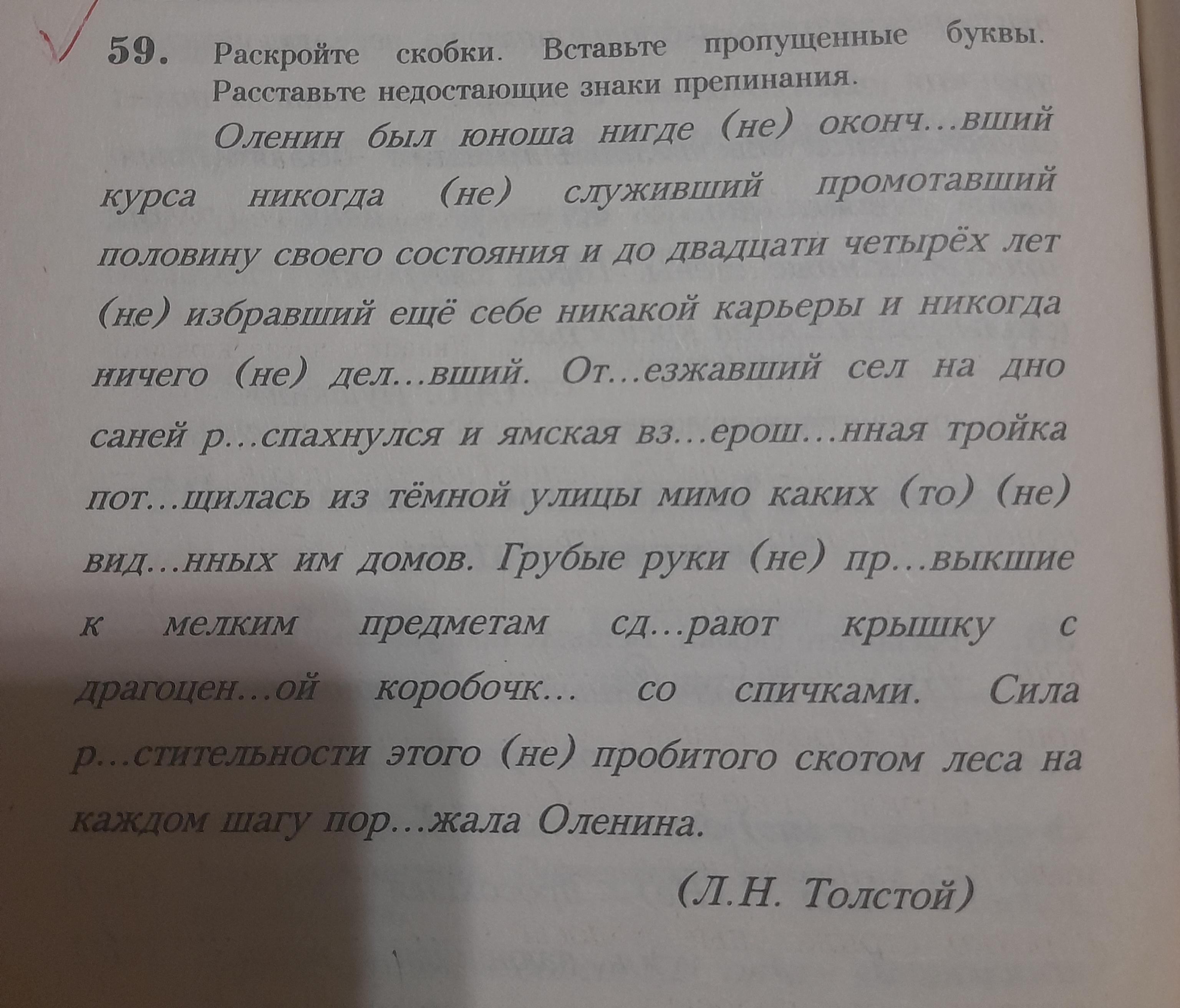 Оленин был юноша,нигде не окончивший курса, никогда не служивший,промотавший половину своего состояния и до двадцати четырех лет не избравший еще себе никакой карьеры и никогда ничего не делавший. Отъезжавший сел на дно саней, распахнулся и ямская взъерошенная тройка потащилась из тёмной улицы мимо каких-то невиданных им домов. Грубые руки, непривыкшие к мелким предметам, сдирают крышку с драгоценной коробочки со спичками. Сила растительности этого не пробитого скотом леса на каждом шагу поражала Оленина.