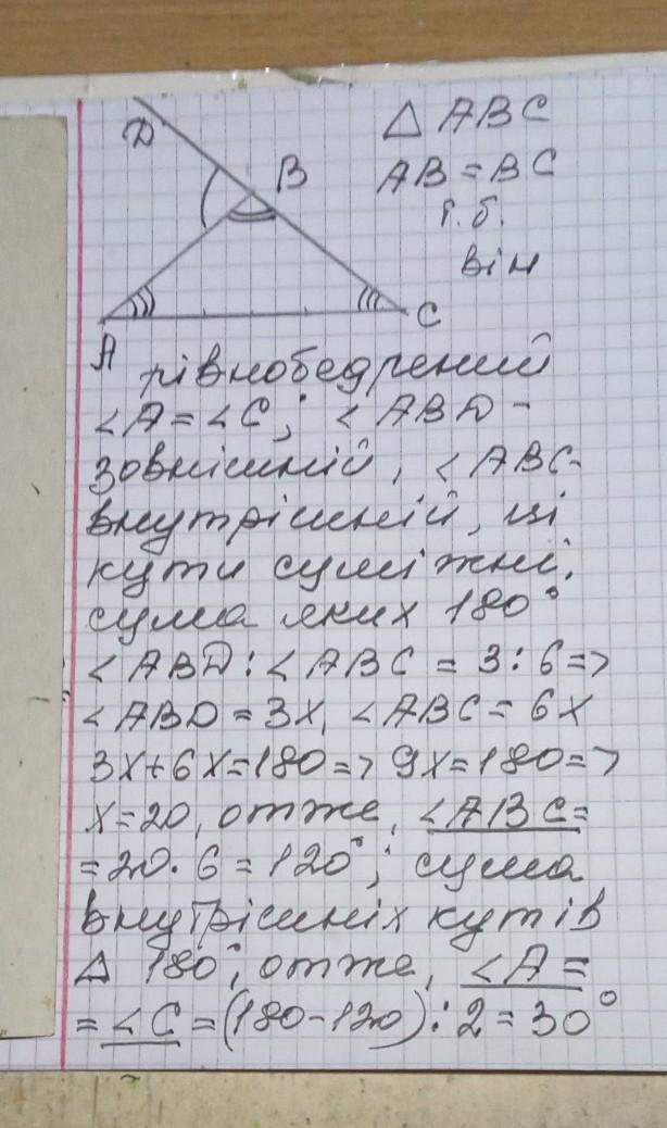 суміжного З ним внутрішнього кута як 3:6. Визначте кути трикутника