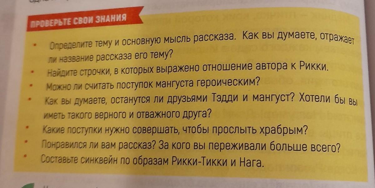 ПРОВЕРЬТЕ СВОИ ЗНАНИЯ Определите тему и основную мысль рассказа. Как вы думаете, отражает ли название рассказа его тему? Найдите строчки, в которых выражено отношение автора к Рикки. Можно ли считать поступок мангуста героическим? Как вы думаете, останутся ли друзьями Тэдди и мангуст? Хотели бы вы иметь такого верного и отважного друга? Какие поступки нужно совершать, чтобы прослыть храбрым? Понравился ли вам рассказ? За кого вы переживали больше всего? Составьте синквейн по образам Рикки-Тикки и Нага. Срочно пожалуйста