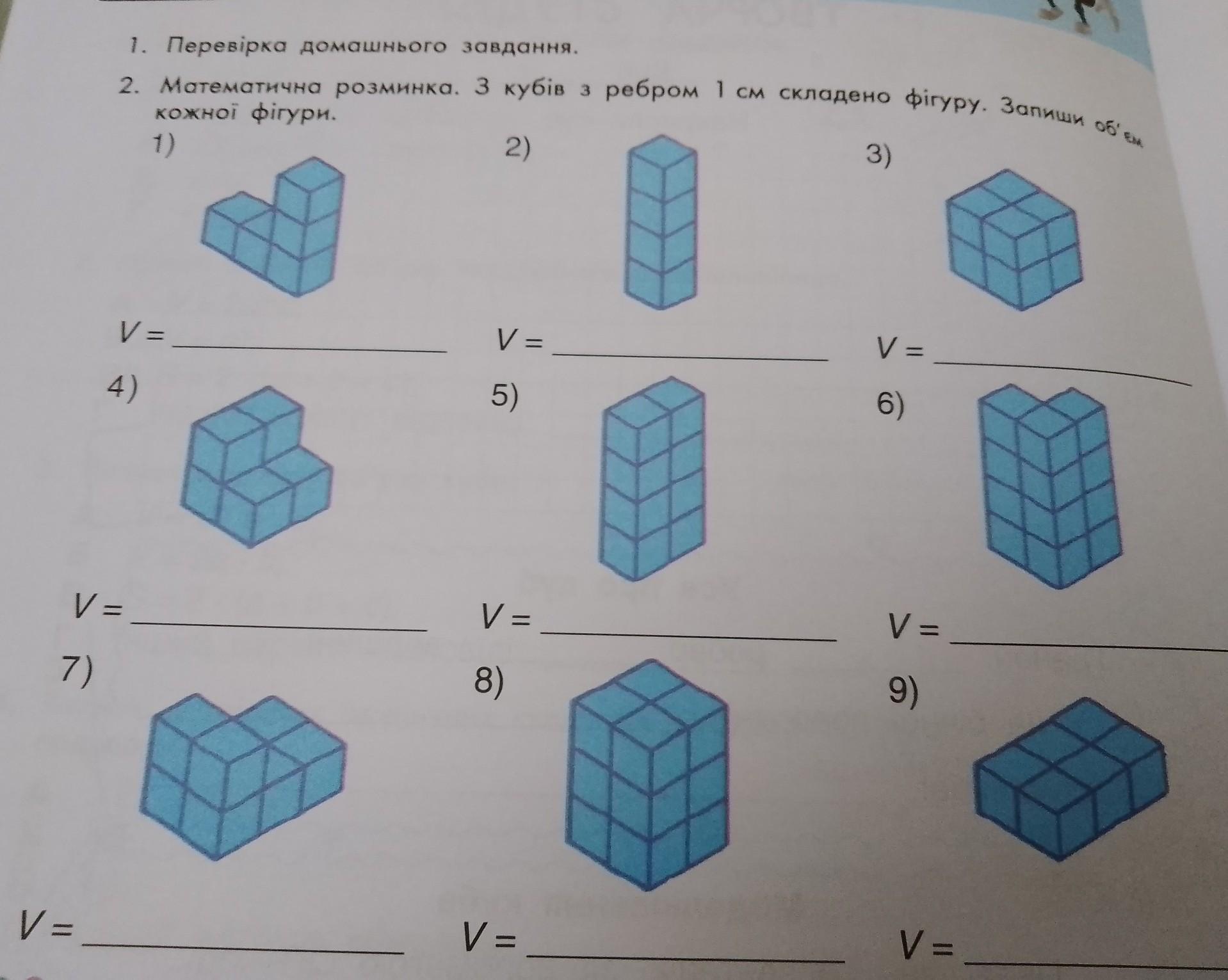 1) кубики одинаковые, всего в фигуре таких кубиков n=5, V = n*V = 5*1 = 5 см³