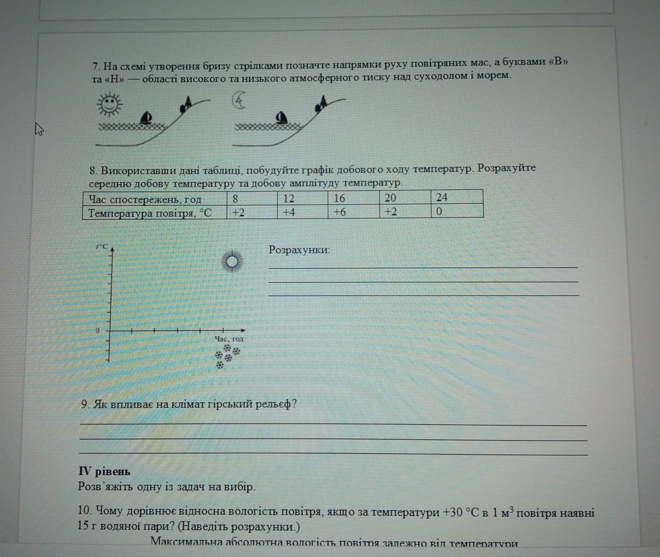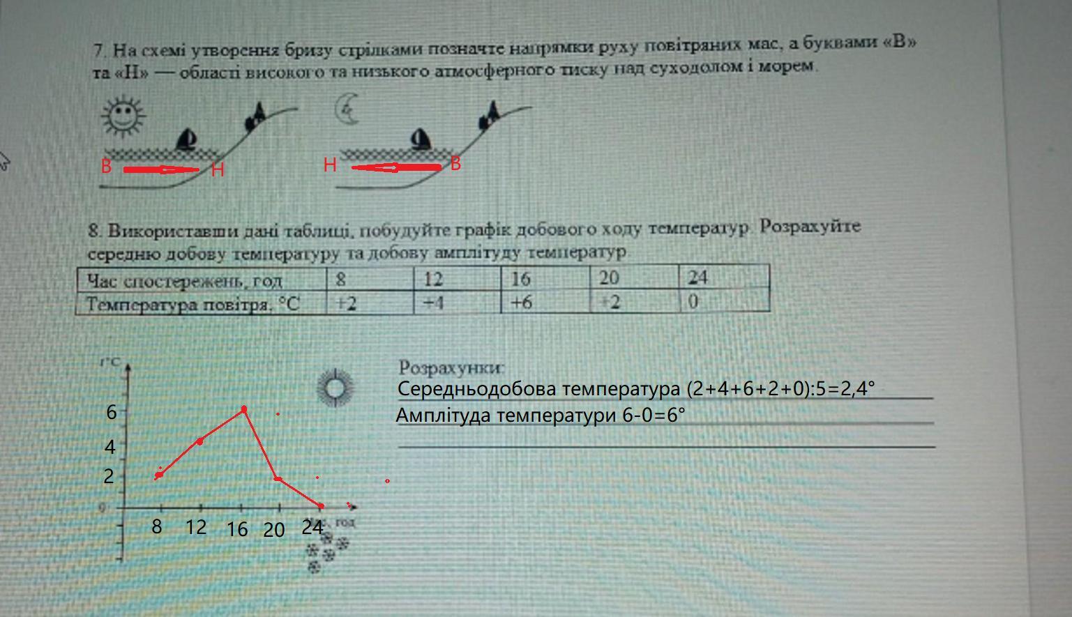 І рівень 7. На схемі утворення бризу стрілками позначте напрямки руху повітряних мас, а буквами > та «H» області високого та низького атмосферного тиску над суходолом і морем. 8. Використавши дані таблиці, побудуйте графік добового ходу температур. Розрахуйте середню добову температуру та добову амплітуду температур. 8 +2 Час спостережень, год Температура повітря, °C 1°C 12 +4 Розрахунки 16 +6 20 +2 24 0