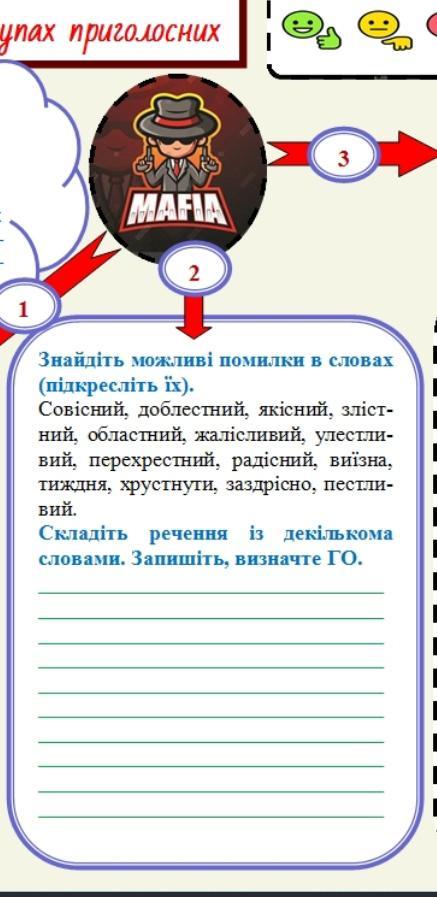 1.Совісний, доблесний, якісний, злісний, обласний, жалісливий, улесливий, перехрестний, радісний, виїздна, тижня, хруснути, заздрісно, пестливий.