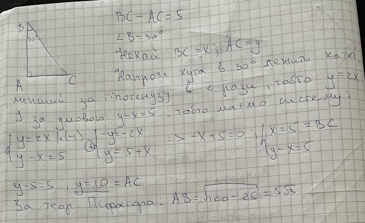 Один із кутів прямокутного трикутника дорiвнюе 30. а різниця гіпотенузи й меншого катета дiть ці сторони трикутника. 5 см. Знайдіть сторони трикутника