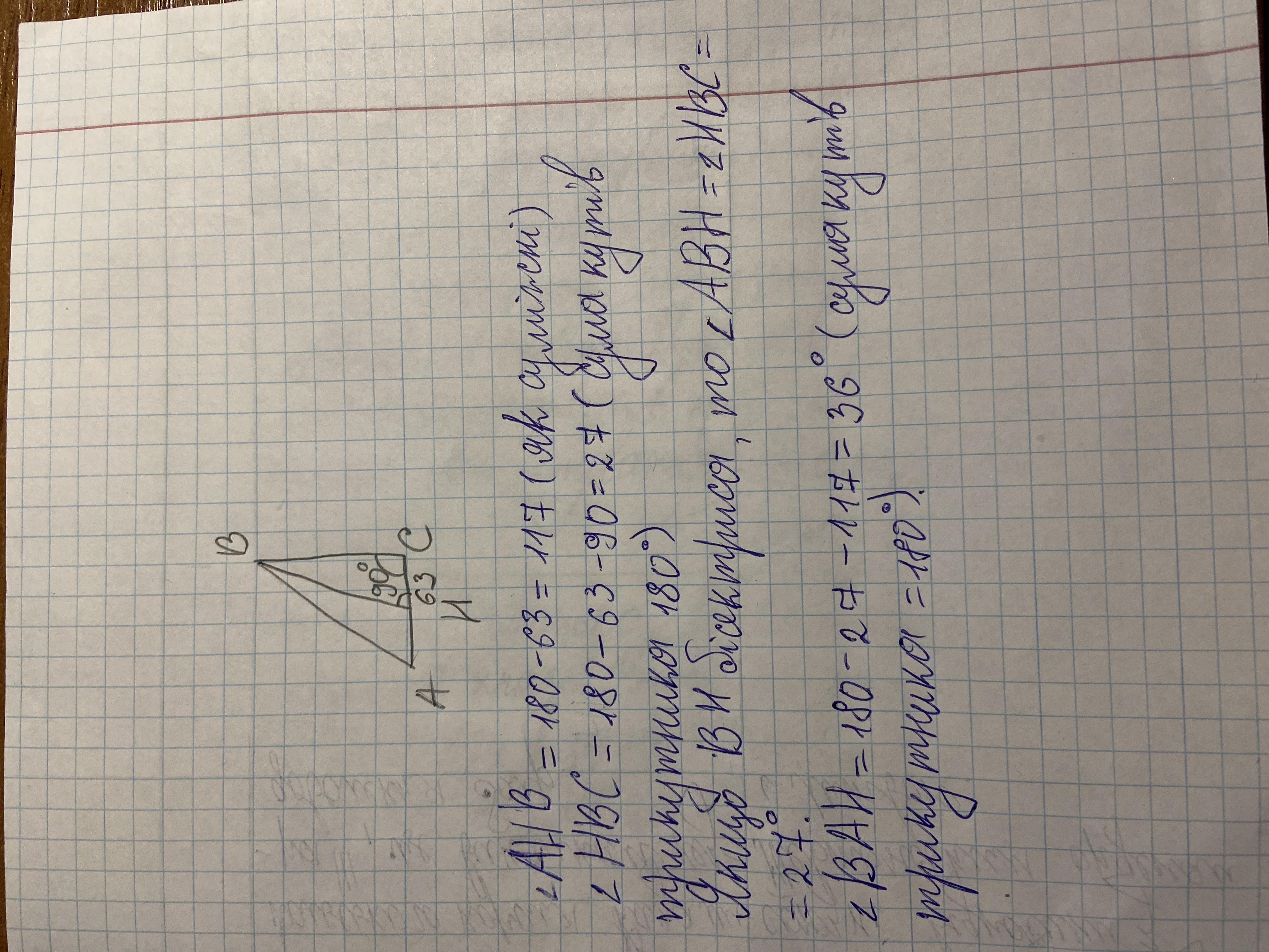 СРОЧНО !!У трикутнику АВС кут С=90°,бісектриса кута В перетинає сторону АС=63°.Знайти кути трикутника