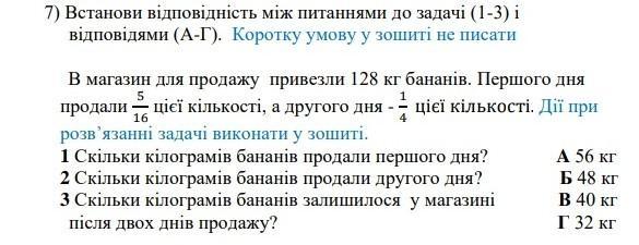 2) 128 * 1/4 = 128/4 = 32 (кг) - бананов продали во 2 день (Г)