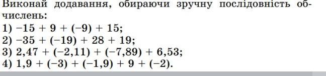 1097. Виконай додавання, обираючи зручну послідовність об- числень: 1) -15 + 9 + (−9) + 15; 2) −35+ (-19) + 28 + 19; 3) 2,47 + (-2,11) + (−7,89) + 6,53; 4) 1,9 + (-3) + (-1,9) + 9 + (-2).