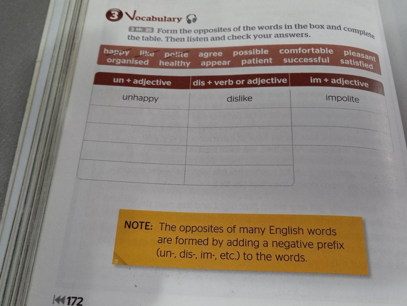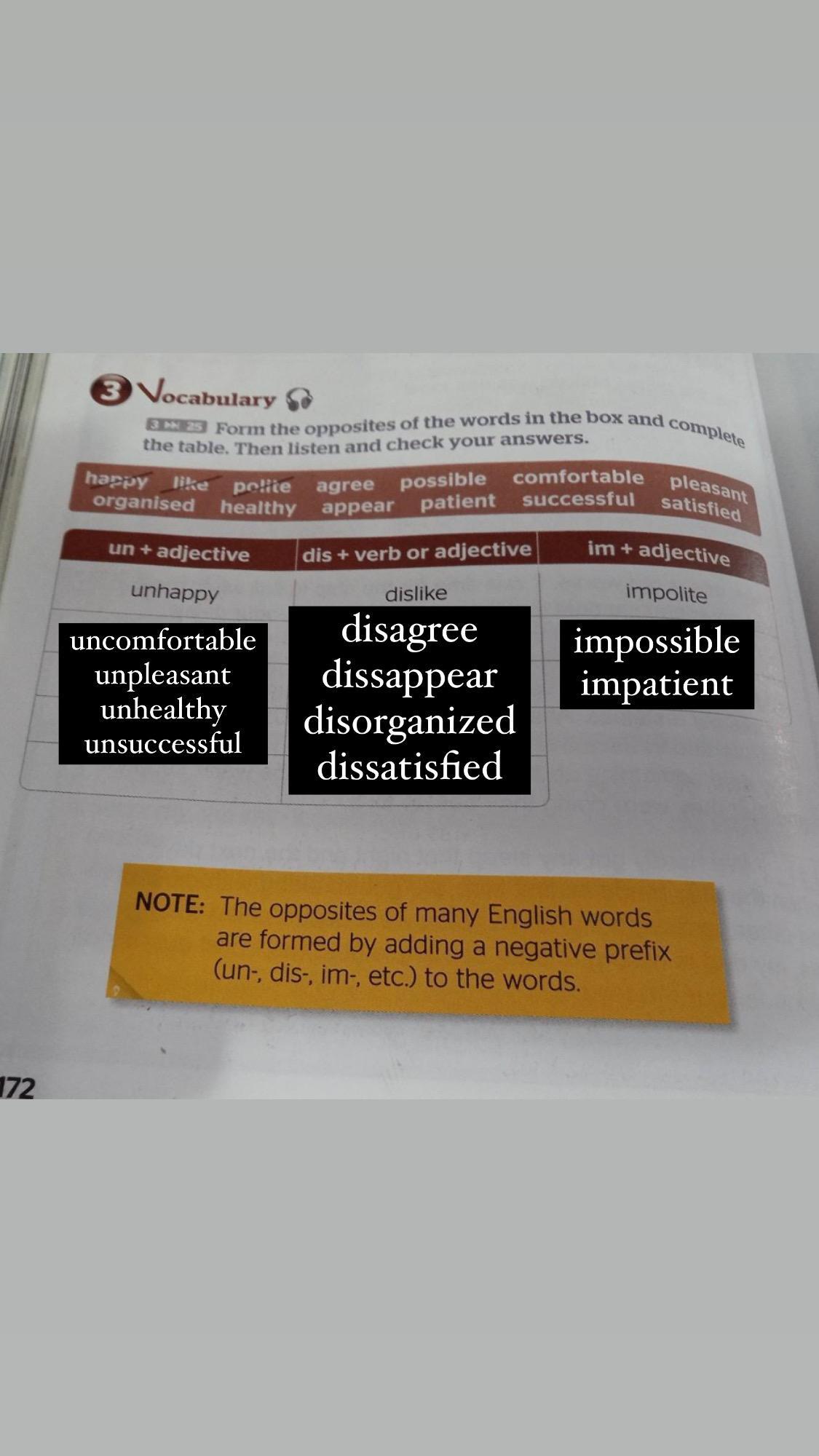 3 Vocabulary 325 Form the opposites of the words in the box and complete the table. Then listen and check your answers. comfortable pleasant comfortable patient successful satisfied happy like polite agree possible agree possible organised healthy appear un + adjective unhappy dis + verb or adjective dislike im + adjective impolite NOTE: The opposites of many English words are formed by adding a negative prefix (un-, dis-, im-, etc.) to the words.