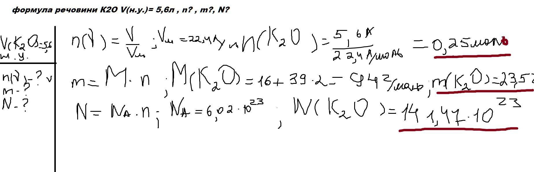 формула речовини К2О V(н.у.)= 5,6л , n? , m?, N?​