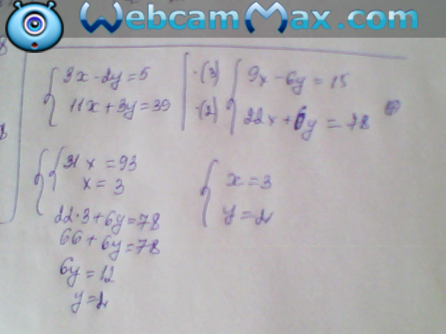 х = (1/3)(5 + 2y) =(1/3)(5 + 2*2) = 3