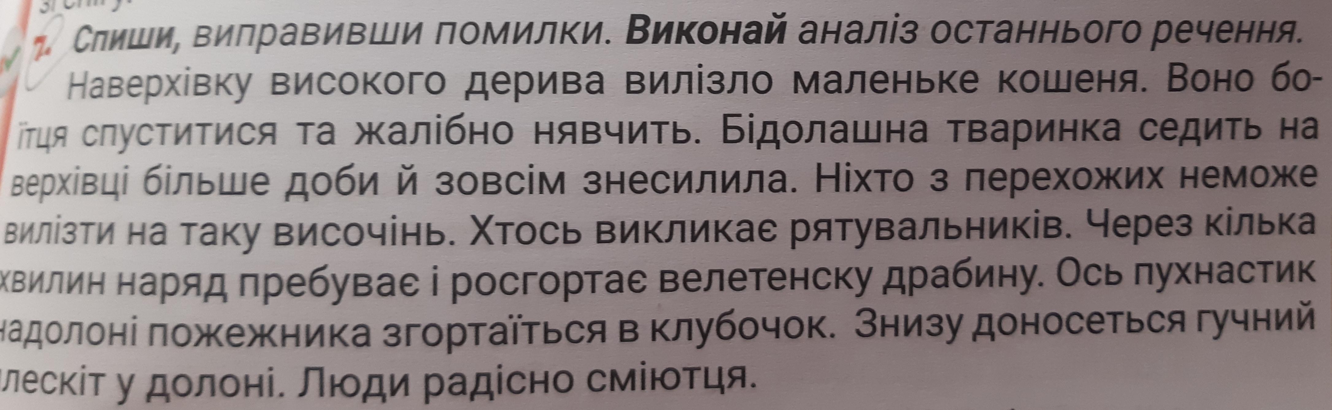 1.На верхівку високого дерева вилізло маленьке кошеня. Воно боїться спуститися та жалібно нявчить. Бідолашна тваринка сидить на верхівці більше доби й зовсім знесилена. Ніхто з перехожих не може вилізти на таку височінь. Хтось викликає рятувальників. Через кілька хвилин наряд прибуває і розгортає велетенську драбину. Ось пухнастик на долоні пожежника згортається в клубочок. З низу доноситься гучний плескіт у долоні. Люди радісно сміються.
