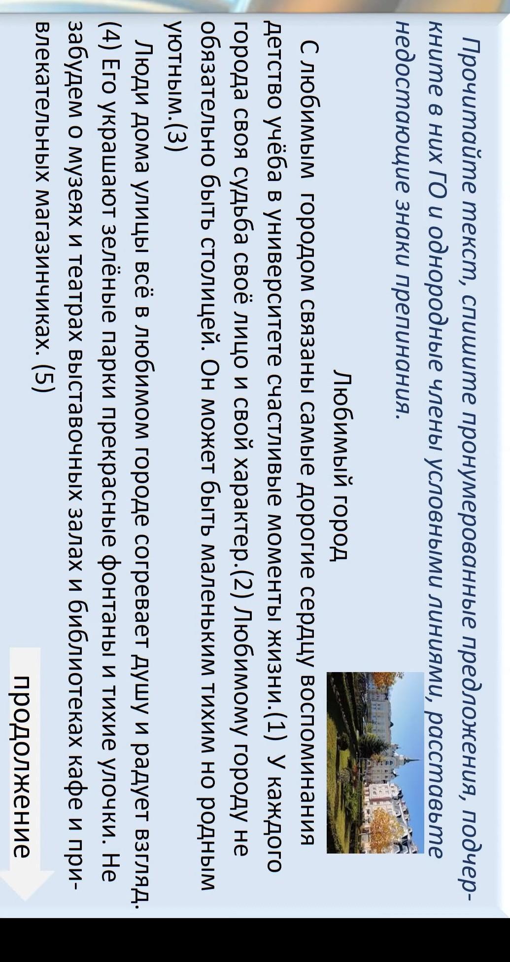Прочитайте текст, спишите пронумерованные предложения, подчер- кните в них ГО и однородные члены условными линиями, расставьте недостающие знаки препинания. Любимый город С любимым городом связаны самые дорогие сердцу воспоминания детство учёба в университете счастливые моменты жизни.(1) У каждого города своя судьба своё лицо и свой характер.(2) Любимому городу не обязательно быть столицей. Он может быть маленьким тихим но родным уютным.(3) Люди дома улицы всё в любимом городе согревает душу и радует взгляд. (4) Его украшают зелёные парки прекрасные фонтаны и тихие улочки. Не забудем о музеях и театрах выставочных залах и библиотеках кафе и при- влекательных магазинчиках. (5) продолжение