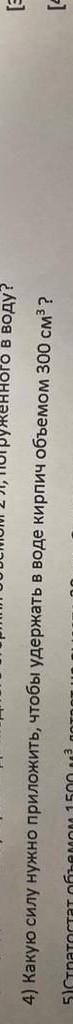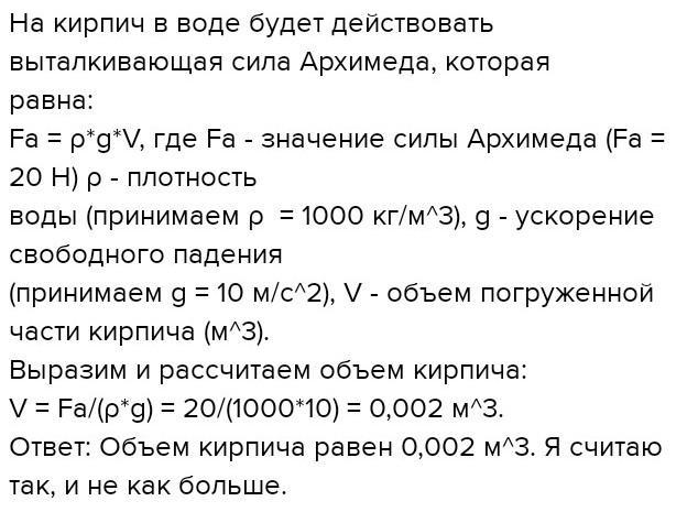 Чтобы удержать в воде кирпич весом 1кг , нужно проложить силу 20 ньютонов F=20 H.mg=Fapx +F