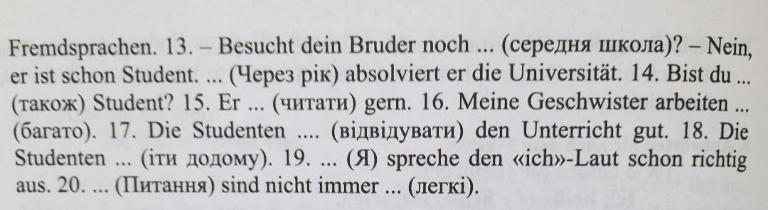 13. Besucht dein Bruder noch die Grundschuhle? - Nein, er ist schon Student. Nach einem Jahr absolviert er die Universität.