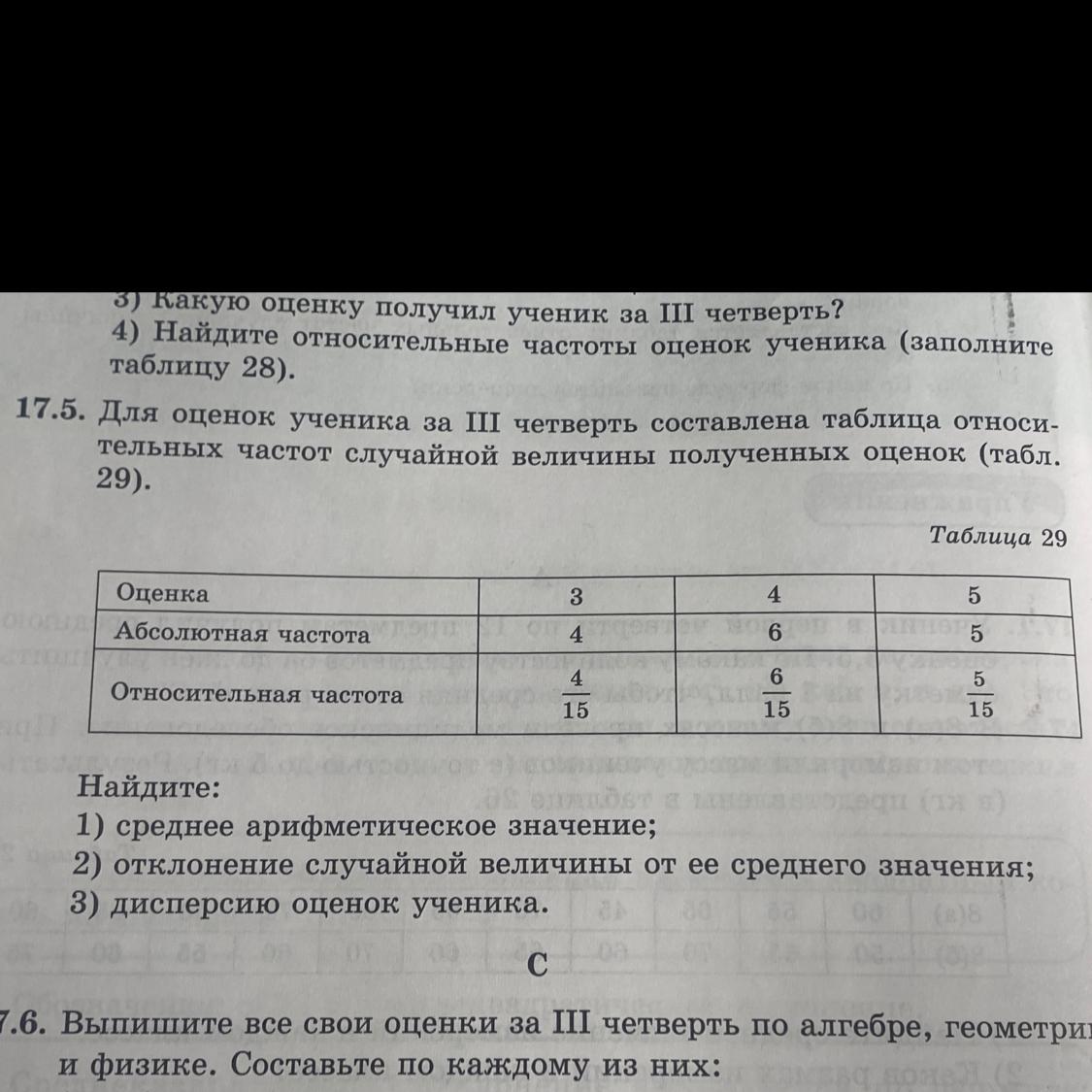 Для оценок за 3 четверть составлена таблица относительных частот случайной величины полученных оценок(табл.29)
