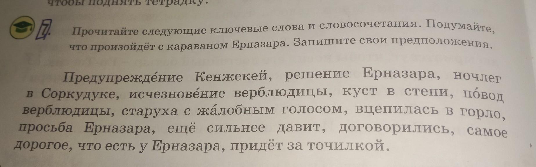 Прочитайте следующие ключевые слова и словосочетания. Подумайте, что произойдёт с караваном Ерназара. Запишите свои предположения. 7. Предупреждение Кенжекей, решение Ерназара, ночлег в Соркудуке, исчезновение верблюдицы, куст в степи, повод верблюдицы, старуха с жалобным голосом, вцепилась в горло, просьба Ерназара, ещё сильнее давит, договорились, самое дорогое, что есть у Ерназара, придёт за точилкой.