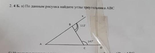2.4 Б. а) По данным рисунка найдите углы треугольника ABC A 3x+19¹ 112 с 6) Используя теорему о внешнем угле треугольника найдите ZB 4 ABC. 524 147" D 163 С