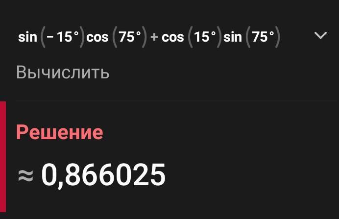 Минус перенести надо на место +. Будет sin15°cos75°-cos15sin75°=sin(15°-75°)=-sin60°=-√3/2 (sin60° по таблице будет √3/2)