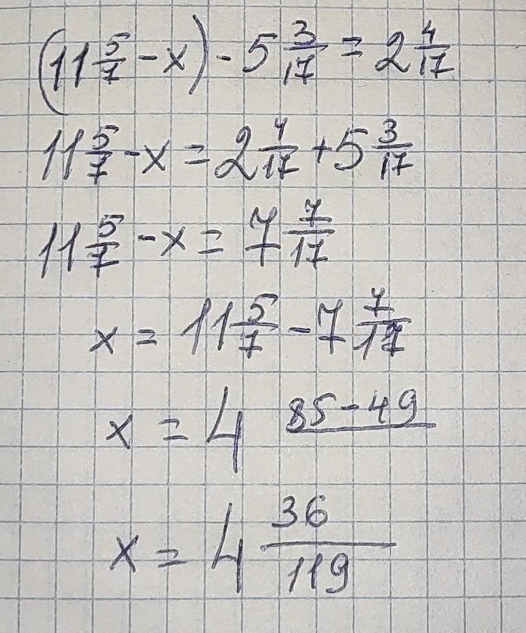 Помогите решить и понять уравнение (11 5/7-х)-5 3/17=2 4/17 пробую пробую, не получается помогите пожалуйста