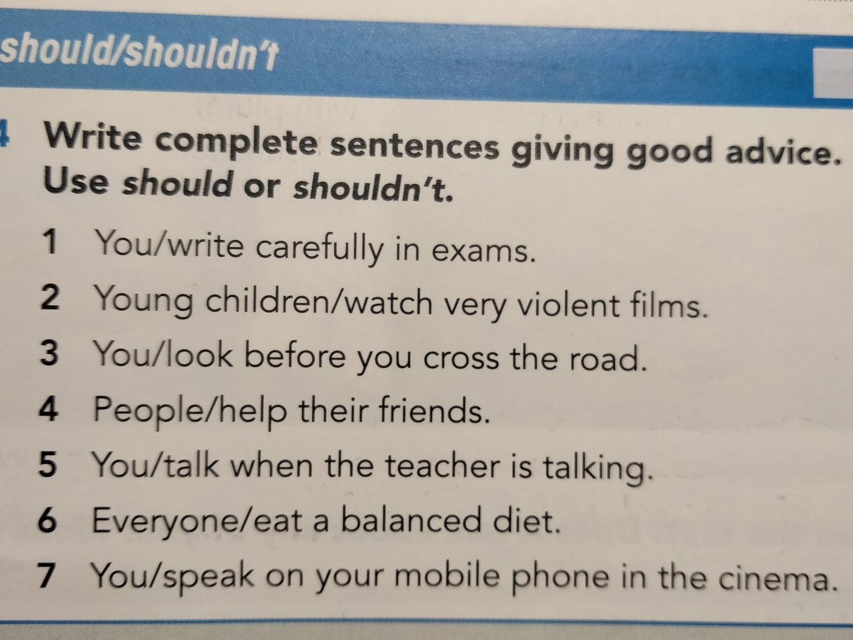 4 Write complete sentences giving good advice. Use should or shouldn't. water. 6 There 1 You/write carefully in exams. 2 Young children/watch very violent films. 3 You/look before you cross the road. 4 People/help their friends. 5 You/talk when the teacher is talking. 6 Everyone/eat a balanced diet. 7 You/speak on your mobile phone in the cinema. FOOD AND DRINK 2 milk /7 poin