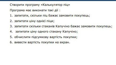 Домашнє завдання Створити програму «Калькулятор піц>> Програма має виконати такі дії: 1. запитати, скільки пiц бажає замовити покупець; 2. запитати ціну однієï пİци; 3. запитати скільки стаканів Капучіно бажає замовити покупець; 4. запитати ціну одного стакану Капучіно; 5. обчислити підсумкову вартість покупки; 6. вивести вартість покупки на екран.це все на сайті репліт потрібно зробити!!!!!